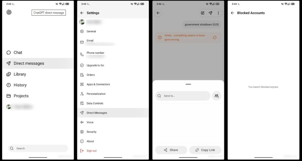 سرنخ هایی که این توسعه را تایید می کند در کد برنامه آپدیت نسخه بتای ChatGPT نسخه 1.2025.273 اندروید کشف شد. مهندس نرم افزار Tibor Blaho در پستی در پلتفرم X اظهار داشت که ویژگی DMs به کاربران امکان می دهد هم به صورت یک به یک و هم در چت گروهی ارتباط برقرار کنند.