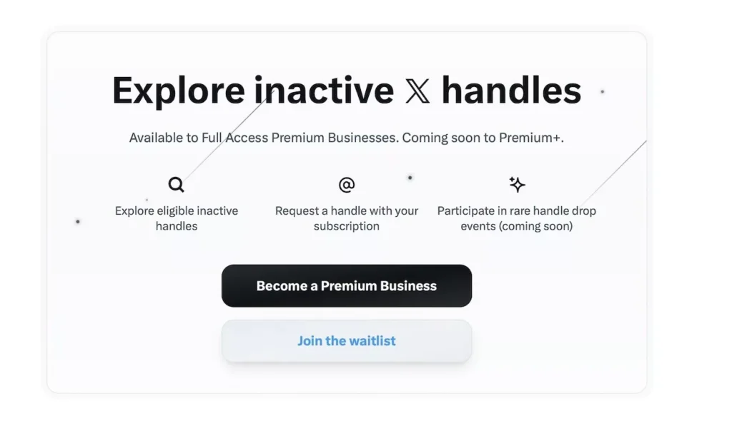 X Handle Marketplace تنها برای کاربرانی با اشتراکهای پریمیوم پلاس (حدود ۱۶ دلار در ماه) یا پریمیوم بیزینس (حدود ۳۲ دلار در ماه) در دسترس است. این کاربران میتوانند به لیست نامهای کاربری غیرفعال دسترسی پیدا کنند و برای تصاحب آنها درخواست دهند. طبق اعلام ایکس، این مارکتپلیس شامل دو نوع نام کاربری است: